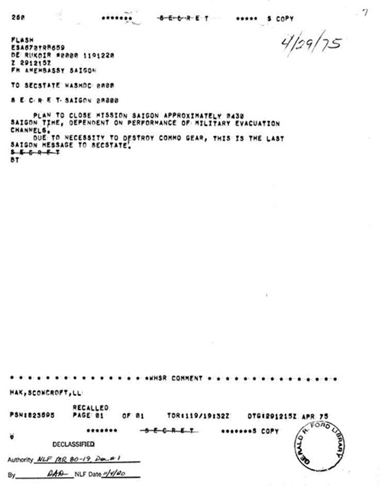 The last telegram sent from the US Embassy in Saigon to the State Department 40 years ago “Plan to close mission Saigon Approximately 0430 Saigon time, dependent on performance of military evacuation channels. Due to necessity to destroy commo gear, this is the last Saigon message to secstate. Secret.”. I - was a teenager then, arrived at this gate on April 29th right after 4:30 pm so it was too late to get in. Stood outside of the gate and witnessed the biggest evacuation of all times, with helicopters landed and took off all night until the early morning of April 30th. There was a reason why I was late to get to the Embassy. My uncle (my Dad's cousin) was a CIA agent and he supposed to take me and my sister with him when he was evacuated for the US. The first attempt was the afternoon of the 28th when we were waiting on the rooftop of his house to be picked up by helicopter. However, there was rocket bombardments at Tan Son Nhat Airport that afternoon so the plan was cancelled. He was instructed to go to the US Embassy the next day before 4:30 pm instead. There was a little problem with the whole evacuation thing. My Uncle's wife was no where to be found along with their adopted son. He was desperately looking for them. By the time he decided to go to the Embassy, it was too late. The ending was really a heart broken. My Uncle committed suicide right after the fall of Saigon. And what happened to his wife, you may ask? It turned out that she was also a spy working for the other side. Not sure if he knew that before committing suicide. You would have thought this kind of things only happened in a Thriller Movie. A sad ending for an unnecessary war.