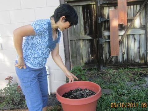 Thu Hiền thò tay nhổ nhúm cây con đang mọc giữa chậu lên: