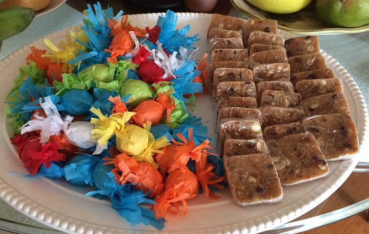 Tùy ý tận dụng phần lụn vụn sau khi làm của một vài loại mứt dẻo hoặc mua mứt làm sẵn, mỗi thứ chỉ cần vài chục gram cho một ổ bánh dài chừng 20 x 6 x 6 cm. Phân lượng gợi ý dùng cỡ chén ăn cơm thông thường để làm đơn vị.