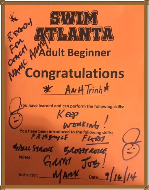 Vạn sự khởi đầu nan, tôi luyện tập riết, coi như đường đời, đường sông, đường biển gì tôi cũng đã từng trải qua. Hy vọng có ngày ghi danh dự thi Bơi Lội OLYMPIC. Vì dù gì đi nữa, hôm tốt nghiệp Huấn luyện Viên đã tuyên bố: Cậu Bé đạt Huy chương Vàng, cô em tôi đạt Huy Chương Bạc ... Và tôi được nhận Huy Chương Đồng - trong lớp học chỉ có ba đứa !