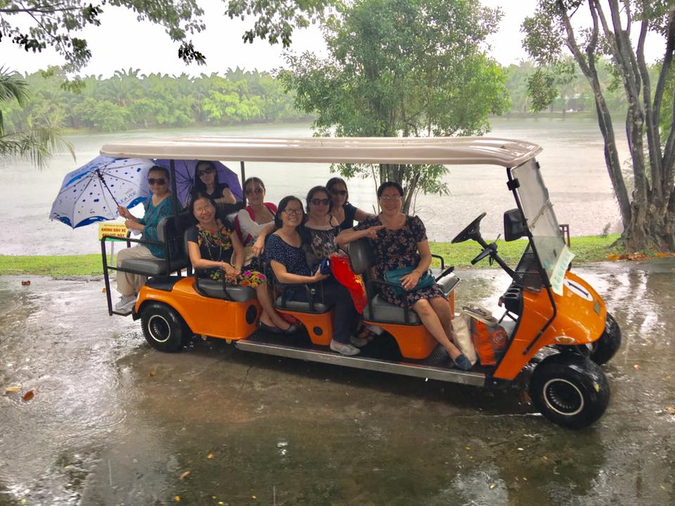 Ngồi ăn và nghỉ chân chuyện trò chừng tiếng đồng hồ là các nàng đứng dậy rủ nhau cùng đi xe điện ngắm cảnh. Vào khu để xe chọn thuê một chiếc tám chỗ rộng rãi xong vừa định kêu bác tài tới chở thì trời bỗng đổ mưa. Ôi sao xui quá, mới mười một giờ rưỡi trưa chớ mấy! Mong cho mau tạnh để tiếp tục cuộc hành trình khám phá nơi này, đã được đi nhiều đâu.
