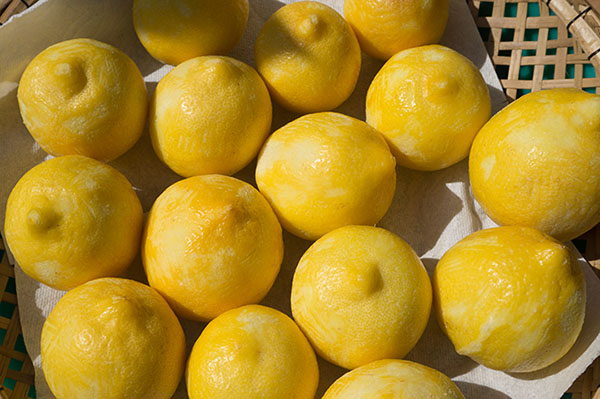 Bước 3: Cho chanh ra phơi khô (1 nắng). Phơi đến khi vỏ chanh bắt đầu khô lại và hơi chuyển sang màu nâu. Sau đó xếp chanh vào lọ thủy tinh. Dùng dụng cụ gài để giữ chanh không bị trồi lên khỏi mặt nước muối.