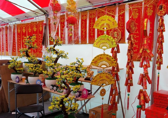 Đối với truyền thống của dân tộc Việt Nam chúng ta, ngày Tết không thể thiếu hoa chưng trong nhà, nhất là trên bàn thờ gia tiên. Cũng vì lý do đó, nhà dù nghèo đến cỡ nào cũng cố gắng có trong nhà chậu hoa, nhành mai, đào... Cho nên khi đi chợ Tết là người Việt ở Little Saigon đến chợ hoa trước tiên. Một rừng hoa đủ các loại hoa truyền thống như cúc, lan, vạn thọ, mai, đào... Người người dập dìu các gian hàng bán hoa làm cho không khí ở chợ hoa xao động và vui vẻ. Những thiếu nữ tươi trẻ đứng ngắm những chậu hoa đang khoe sắc, tự dưng tôi có ý so sánh giữa người và hoa , ai đẹp hơn?