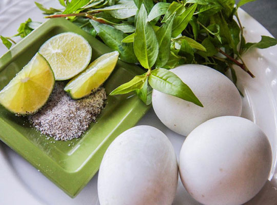 Về nhà đã thấy anh luộc con vịt nấu cháo đậu xanh; rau thơm, mắm gừng đầy đủ. Trên bàn có đĩa thịt heo luộc, rau sống, bánh tráng...trên bếp có mấy quả hột vịt lộn đang luộc!