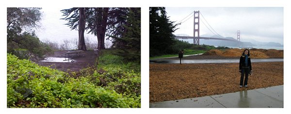 Chúng tôi tìm được chỗ đậu xe cũng khá gần cầu. Ngoài trời mưa lất phất và rất lạnh vậy mà cũng có nhiều người chạy bộ và đi xe đạp tập thể dục dưới mưa, có lẽ họ cũng như chúng tôi, muốn thử sức đầu năm. Chúng tôi che dù và thong thả đi bộ dưới mưa. Vừa đi vừa ngắm cảnh vừa ôn lại những kỷ niệm hôm cùng TS, NN, NA dạo chơi ở nơi này. Mưa gió lạnh lẽo như vậy mà đàng kia nàng vẫn lỳ lợm nằm khỏa thân. Còn đàng kia là nơi mà TS và NA làm dáng chụp hình bên cạnh hai cây thông cao …