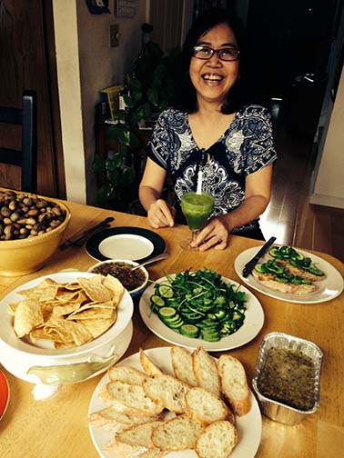 Trên bàn có sẵn tô đậu phụng nấu, dĩa hạt walnut, Vân nhanh nhẹn pha nước uống với rau spinach, kale....cùng