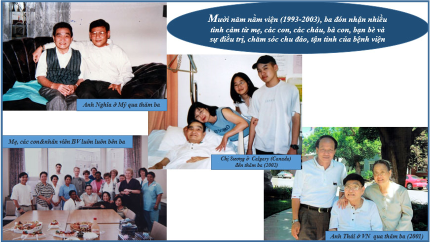 Mười năm chăm sóc chồng đau nặng trong bệnh viện, không có ngôn từ nào mà tôi có thể diễn đạt hết được tình yêu thương mà mẹ tôi đã dành cho ba tôi. Biết bao khó khăn vất vả mà mẹ tôi gặp phải trong thời gian chăm sóc ba tôi, mẹ tôi cũng cam lòng. Các chị em tôi ở bên Canada bận công ăn việc làm, còn lo cho con cái nên thì giờ dành cho ba có phần giới hạn. Chị em tôi ở VN xa xôi, thư từ, điện thoại khó khăn, chúng tôi chỉ biết cầu nguyện ơn trên phù cho ba tôi tai qua nạn khỏi, chóng bình phục, mẹ tôi dồi dào sức khỏe, ổn định tinh thần để chăm sóc ba tôi.