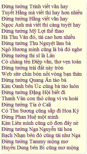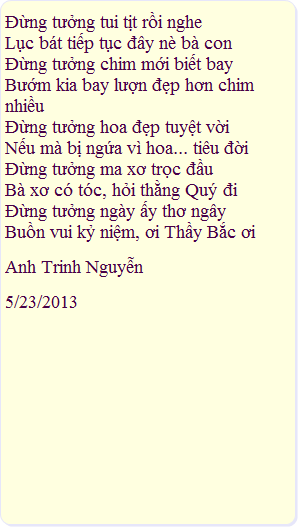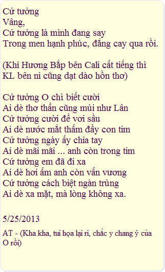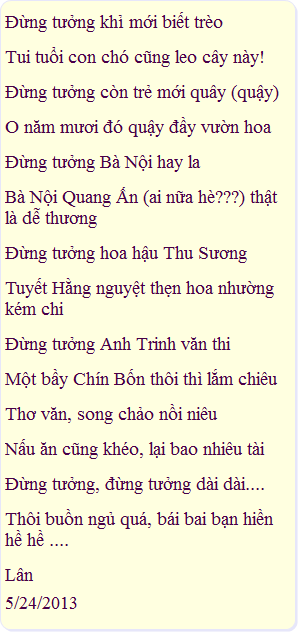 5/23 TN - Haha, chịu thua mợ AT luôn, lục bát tuôn ra như thác, chắc là được ''Bà'' nhập rồi nên sung quá!