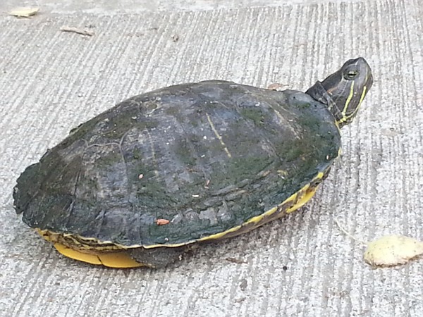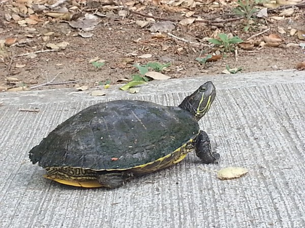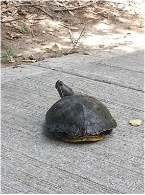 gặp một con rùa đang bò trên lối đi. Lần đầu tiên trong đời thấy rùa bò lang thang ngoài thiên nhiên, tôi rất ngạc