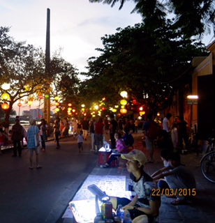 Phố đi bộ Hội An chiều thứ bảy khá đông người qua lại. Du khách thích đến Hội An vì những ngôi nhà cổ rêu phong, vì những con đường nhỏ hẹp như chỉ với một cái thì người hai bên đường có thể chạm tay nhau. Người đông nhưng không khí vẫn thanh sạch và êm ả. Cái náo nhiệt của đô thị không đến được đây, dù hằng ngày những con đường đi vào phố vẫn tấp nập xe cộ. Lạ lắm, ở đây người ta có thể đi lang thang dưới lòng đường, lẫn vào trong đám đông, nhưng cảm giác bình yên, tự tại thì vẫn có. Vào đây, hình như người ta sống chậm hẳn lại rồi: thở chậm, nói chậm, đi chậm. Tất cả đều chùng một nhịp...