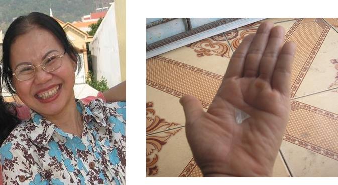 Tự nhiên ông bác sĩ la lên “Trời ơi miếng mảnh chai lớn như vầy mà lọt được vào mũi hồi nào vậy nè”. Thằng con tui kinh ngạc, tui cũng ngạc nhiên không biết vì sao mà mũi mình có miếng mảnh chai. Ông Bác sĩ gắp miếng mảnh chai ra, kéo tới đâu, đầu tui đi theo đó vì sợ hay là đau tui cũng không rõ nữa. Lấy ra xong ông liệng lên chiếc khay khám bệnh, mũi tui máu me tùm lum. Lúc này tui không có đeo kinh nên nhìn không rõ miếng mảnh chai vì vậy không nhớ nguyên nhân vì sao nó lọt vào mũi mà tui không hay zầy nè. Tui hỏi bác sĩ xưa nay có việc “thư, ếm” không, tui nghe nói ghét ai người ta đi “ếm” hoặc “thư” nào là đinh, tóc, miễng chai. Ông bác sĩ nhìn tui cười vì câu hỏi ngây ngô của bà già 60 mươi tuổi này mà không trả lời. Ông gói miếng mảnh chai lại đưa cho tui bảo đem về xem và làm kỷ niệm hi hi hiii