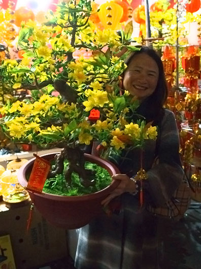 Tôi nhìn theo hướng cô em chỉ … Trên mui chiếc xe vans đang đậu ở góc đường, một cây Mai tròn trịa, hoa nở rộ, không một lá. Đẹp tuyệt!