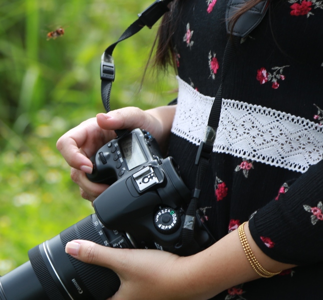 Vùng đất nầy lau lách và cây rừng um tùm quá, chắc chắn cũng là nơi lý tưởng cho bầy ong làm tổ, và cũng vì mùi hương lạ vẫn còn phảng phất quanh chúng tôi. Rút kinh nghiệm, và để chắc ăn, tôi bẻ mấy cây lau cầm sẵn, đi theo hộ tống người đẹp, để cho cô ấy được yên tâm và tự do săn ảnh. Thỉnh thoảng, vài ba con ong lảng vảng vu vơ, nhưng hình như chúng nó sợ tôi nên không dám đến gần người đẹp. Người ấy bảo tôi đi tác nghiệp đi, nhưng qua ánh mắt và nụ cười của nàng mà tôi đọc được là nàng thích tôi đi canh chừng ong. Tôi bảo với nàng là hôm nay anh thích làm tài xế và cận vệ cho một giai nhân, mặc cho mấy chàng kia ham nghệ thuật mà quên đi cơ hội này. Nàng cười hớn hở, trên khuôn mặt biểu cảm một tài-sắc vẹn toàn. Đúng vậy, người ấy không chỉ học giỏi mà còn đam mê nhiếp ảnh, âm nhạc và thể thao. Người ấy du học ở Úc, sau khi ra trường, nàng tiếp tục làm việc cho một Đại Học bên Úc, nhiệm vụ về Huế lần này là tuyển NCS du học tại ĐH bên đó.