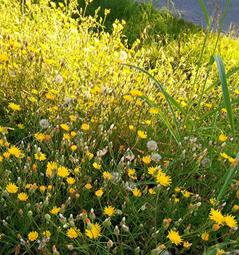 Dọc theo những hàng cây xanh, nắng đổ chen vào những tàn cây kẻ lá, vỉa hè bông hoa dại nhảy múa lăng tăng, bóng con nhỏ năm nào lại mơ màng nhớ ....