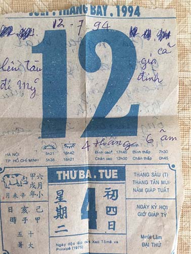 July 12 1994, tờ lịch cũ Má còn giữ ghi dấu ngày Ba đưa 4 người con và một đứa cháu ngoại đi Mỹ, theo chương trình H.O 35 nhưng được đôn lên H.O 16; nghe nói nhờ có sự can thiệp của phía Mỹ, ba ở tù hơn 10 năm.