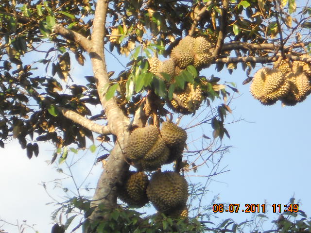 Và đây là hình cây sầu riêng trong vườn (tớ không dám đứng dưới gốc cây vì đang còn yêu đời lắm, thông cảm)