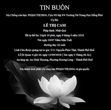 9/10 Anh Trinh - Nhạc mẫu của bạn Phạm Thị Hoa, cụ bà Lê thị Cam vừa tạ thế tại thành phố Huế, ngày 09/09/2018. Hưởng thọ 82 tuổi.