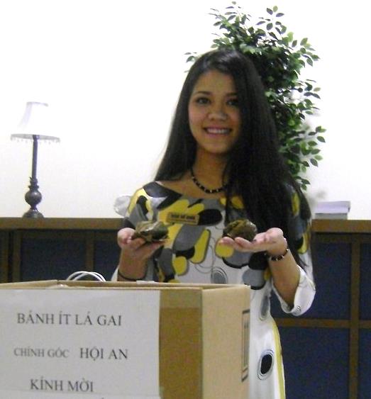 Một cô bé sinh viên tình nguyện mặc áo dài phụ trách bán bánh ít lá gai để sung vào quỹ chi tiêu hàng năm của Hội. Tôi làm cho cô bé một tấm bảng quảng cáo với dòng chữ: BÁNH ÍT LÁ GAI CHÍNH HIỆU HỘI AN, KÍNH MỜI. Cô bé mang đi lòng vòng trong hội trường.
