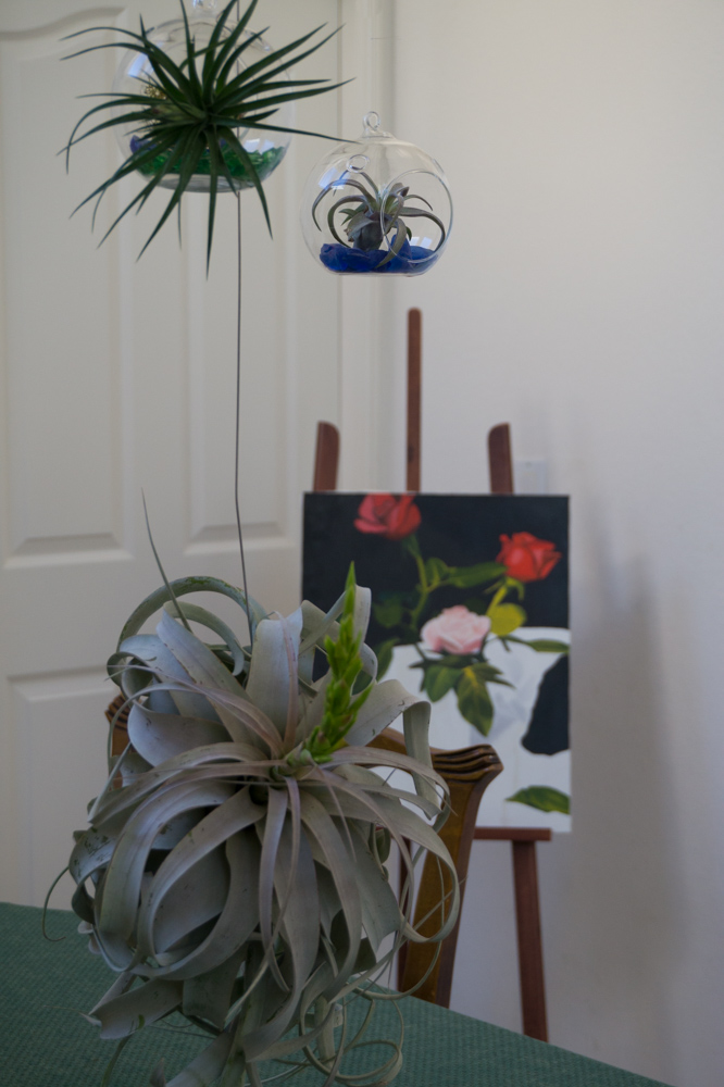 Đã nhiều năm qua, mỗi thứ bảy, tôi thường đi Farmer market gần nhà để mua cam, rau tươi, và thỉnh thoảng ăn trưa với ông xã ở đây. Lâu năm đi lại một chợ đã nhàm, tôi đổi qua đi chợ mới. Tuy xa hơn nhưng từ buổi đầu tôi đã thích khu chợ mới này vì ở đây có thêm nhiều hàng rau tươi (người Á Châu mình rất thích ăn rau, cửa hàng mở đúng 2:30PM nhưng trước đó 5 phút tôi thấy nhiều người đã sắp hàng mua rau muống, rau khoai, rau dền, mướp, bí, …). Sau khi mua những thứ cần mua, tôi thám thính một vòng quanh chợ … Ah! Hàng bán chi đây mà rộn ràng ri nè!!! Thì ra là hàng bán cây không khí (air plants). Tôi ngạc nhiên, khi nhìn thấy khách hàng ngoài những phụ nữ, những cô gái còn có những đàn ông, thanh niên, ... đang vui vẻ chọn lựa air plants. Nhìn nét mặt ai cũng thích thú, hứng khởi sau khi chọn được hai, ba cây vừa ý, tôi vui lây rồi bị lôi cuốn theo. Sau khi nhìn nhìn, ngắm ngắm tôi cũng chọn được 4 cây cho mình. So với lần trước, lần này tôi thích thú hơn nhiều. Về lại nhà, việc đầu tiên là tôi đem mấy lọ hoa be bé ra cắm vào, ra vô hớn hở ngắm nghía. Tôi lên internet đọc thêm cách săn sóc, tò mò xem cách trình bày của thiên hạ. Nhiều kiểu trình bày nhìn đơn giản nhưng đẹp, và thật lạ … Tôi vô cùng ngưỡng mộ ý tưởng phong phú, rất mỹ thuật, … của ai đó, những người đam mê loại cây không khí, chuyên nghiệp cũng như không chuyên nghiệp!