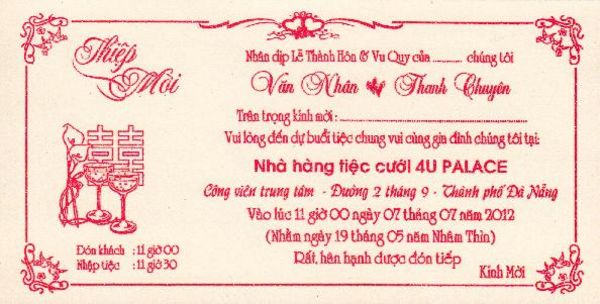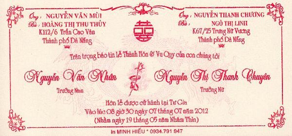 Gia đình của Nguyễn Văn Mùi và Hoàng Thị Thu Thuỷ trân trọng báo tin vui cho nhóm Chín Bốn. Năm nay, gia đình chúng tôi có 3 tin vui: con gái đậu thủ khoa vào đại học và nhận học bổng du học, con trai sắp kết hôn vào ngày 7 tháng 7 năm 2012. Các bạn hãy chia sẻ niềm vui này cùng với gia đình của Thuỷ nhé và kèm theo đây là thiệp cưới của con trai mình gởi đến tất cả các bạn. Bạn nào có thể bớt chút thời gian quý báu của mình đến dự tiệc vui thì hãy nhắn cho mình qua mail: hoang.thuthuy57@yahoo.com hoặc qua trang facebook: Thu Thuy Hoang. Mình xin trân trọng cảm ơn!