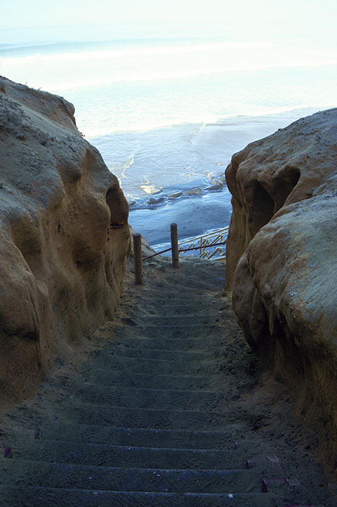 Tiếp tục lần theo Beach Trail. Con đường mòn dài 3/4 dặm và đi xuống khoảng 300 feet dẫn đến băi biển bằng một cầu thang.