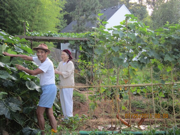 Ba năm sau khi định cư ở quê hương mới này tôi đi mua căn nhà đang ở, hai cha con chọn nhà có sân sau bằng phẳng. Ba ra sức cuốc thêm ra phía sau, lấn vào bìa rừng để mở mang “bờ cõi”. Đất ở Georgia là vùng đồi núi nên toàn là đất đỏ lẫn với đá. Ba miệt mài “có công mài sắt, có ngày nên kim”. Sân sau nhà tôi sau nhiều năm trồng trọt bây giờ là vườn rau với đấy đủ những thứ cần thiết. Nào là dưa leo, mướp, bí đỏ, bí đao, rau muống, rau lang, đậu bắp, rau thơm các loại, diếp cá, ớt, tía tô, khổ qua, đậu ve, rau mồng tơi, dền…là những thứ trồng vào mùa xuân, ăn suốt mùa hè, mùa thu. Đầu mùa thu Ba còn tỉa được ngò rí và rau cải con, cải bẹ xanh để ăn bánh xèo. Những dịp này, buổi sáng ra vườn rau, hương của các loại rau thơm, ngò … tỏa lên ngan ngát, dịu dàng khiến tâm hồn khoan khoái thật dễ chịu. Ba còn ra công đào một rảnh nước song song theo những luống rau, dưới đó Ba thả vài nhánh ngò ôm tức là rau ngổ, bên cạnh là đám bạc hà, hai thứ để nấu canh chua. Ba tận dụng mảnh đất sau nhà làm thành một vườn rau rất tươi tốt, ngăn nắp. Giàn khổ qua phải cách xa giàn mướp ngọt một khoảnh sân, vì ngọt đắng là hai vị khắc nhau, rau quế là thứ kén nhất nên ưu tiên được ‘ngồi” trong chậu. Dây bí đỏ không lên giàn mà được thả cho bò lên đồi, như vậy chịu được mấy chục quả bí nặng nề, chắc nùi nụi. Rau thơm và diếp cá, rau răm được sắp xếp ở gần nhau trông rất đoàn kết. Ba nói, mỗi khi cần ăn rau sống, đem rổ ra cắt một loạt là có đủ các thứ rau thơm không cần đi đâu xa. Rau muống là thứ thích nước nên Ba trồng ô rau muống ở giữa hai rảnh nước, những cọng rau muống xanh mướt thấy mà ham!